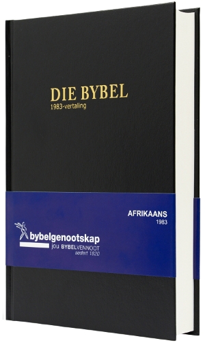 Volledige Bybel Afrikaans 1983-vertaling (met herformulerings). Mediumgrootte Swart hardeband Nuwe leservriendelike uitleg. Voorwoord kruisverwysings voetnote woordelys en kaarte en Kleur-ID-band wat teksgrootte aandui.
